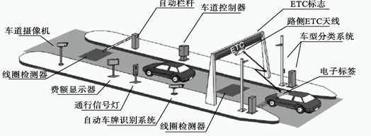【27】ETC电子收费系统又称不停车收费系统,通过车载电子材签与收费站ETC车道上的微波天线之间短程通讯,利用射频识别技术(ETC需要电源,作用距离在10米左右)自动感应识别车辆,再用计算机网络技术与银行进行收费结算处理,实现车辆通过高速公路收费站时无须停车就能交纳费用。ETC电子收费系统也用于市区过桥、过隧道自动扣费,在停车场管理中也可使用,大幅提高出入口车辆通行能力。结合图示回答以下问题: