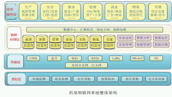 【27】乘坐飞机出行是现代交通的出行方式之一。机场通过运用物联网、大数据分析和人工智能等技术,实现机场运营管理、服务保障和安全防范的智能化、自动化和信息化,具有高效、安全、舒适、环保等特点。在现代机场的运营体系中,物联网起到了关键作用,通过采用物联网技术的智能化设备和系统,机场能够更加高效地处理各种信息,提高航班准点率,改善旅客体验,同时也能加强机场的安全性能。图中为某机场物联网系统整体架构,结合图示回答以下问题: